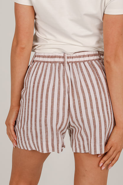 The Sweet Energy Brown Striped Shorts create a look that will spend its days effortlessly impressing! Made from a breathable linen-blend fabric, these shorts feature a timeless vertical stripe pattern in warm brown and crisp white tones. The relaxed fit and lightweight feel make them ideal for sunny days, while the tailored look keeps things polished. Pair them with a simple tank or matching top for an easy, put-together outfit you'll reach for all season long!