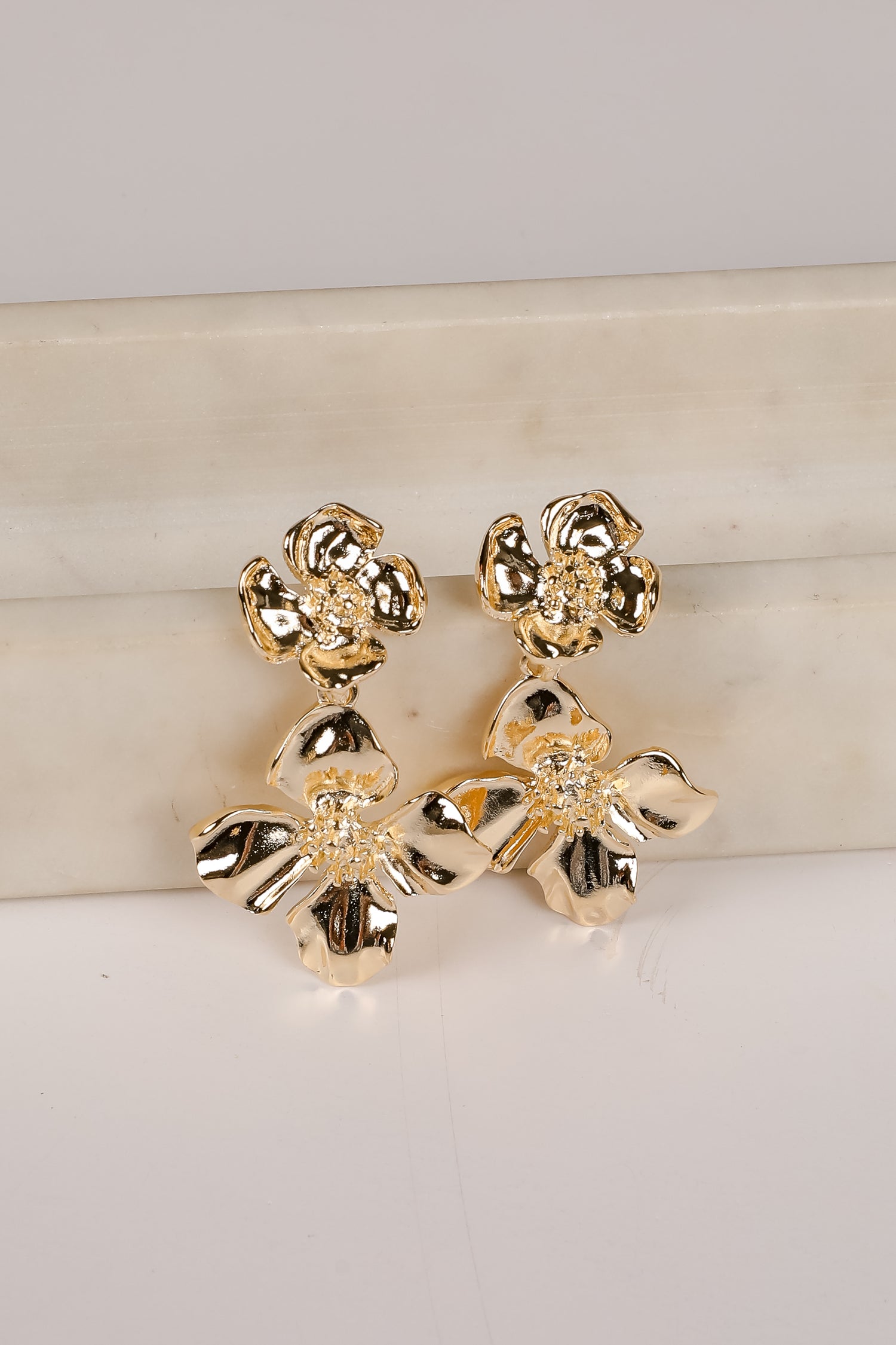 If you're headed somewhere with endless sand and surf, the Sydney Gold Flower Drop Earrings are a must-have to complete all your beachy ensembles! These trendy earrings start with a stud post back and drop to large gold flowers. Add these fun earrings to a black dress + heels to add a chic touch to your date night look!