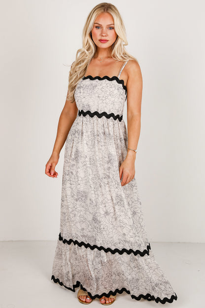If the Talk It Through Ivory Floral Tiered Maxi Dress doesn't fit into your date night outfit rotation, we don't know what will! Featuring a delicate black floral print on a soft cream backdrop, this dress flows beautifully with a tiered silhouette that adds movement and grace. Thoughtful rickrack trim accents each tier, offering a touch of playful texture and nostalgic charm. Perfect for garden parties, weekend outings, or special occasions, this maxi dress blends timeless style with a whimsical twist!