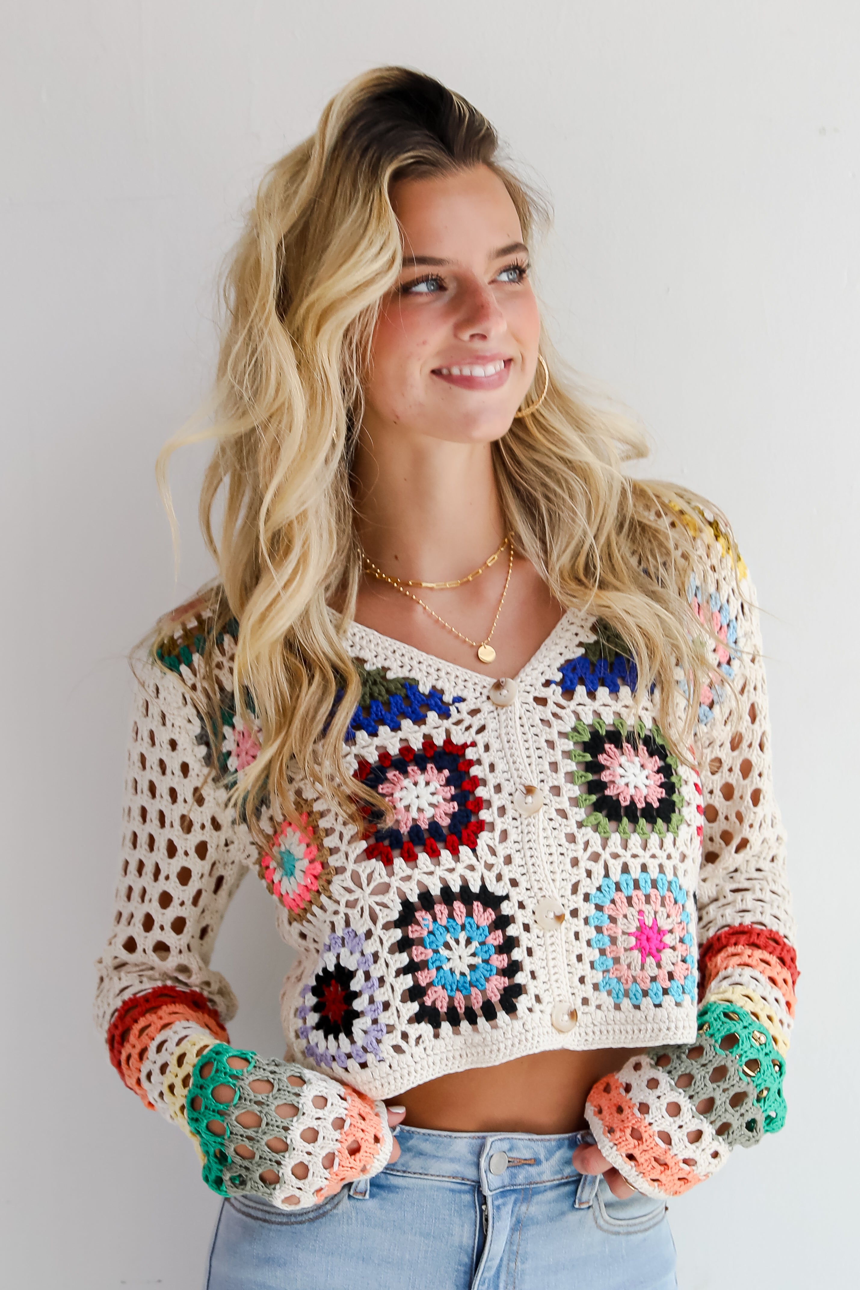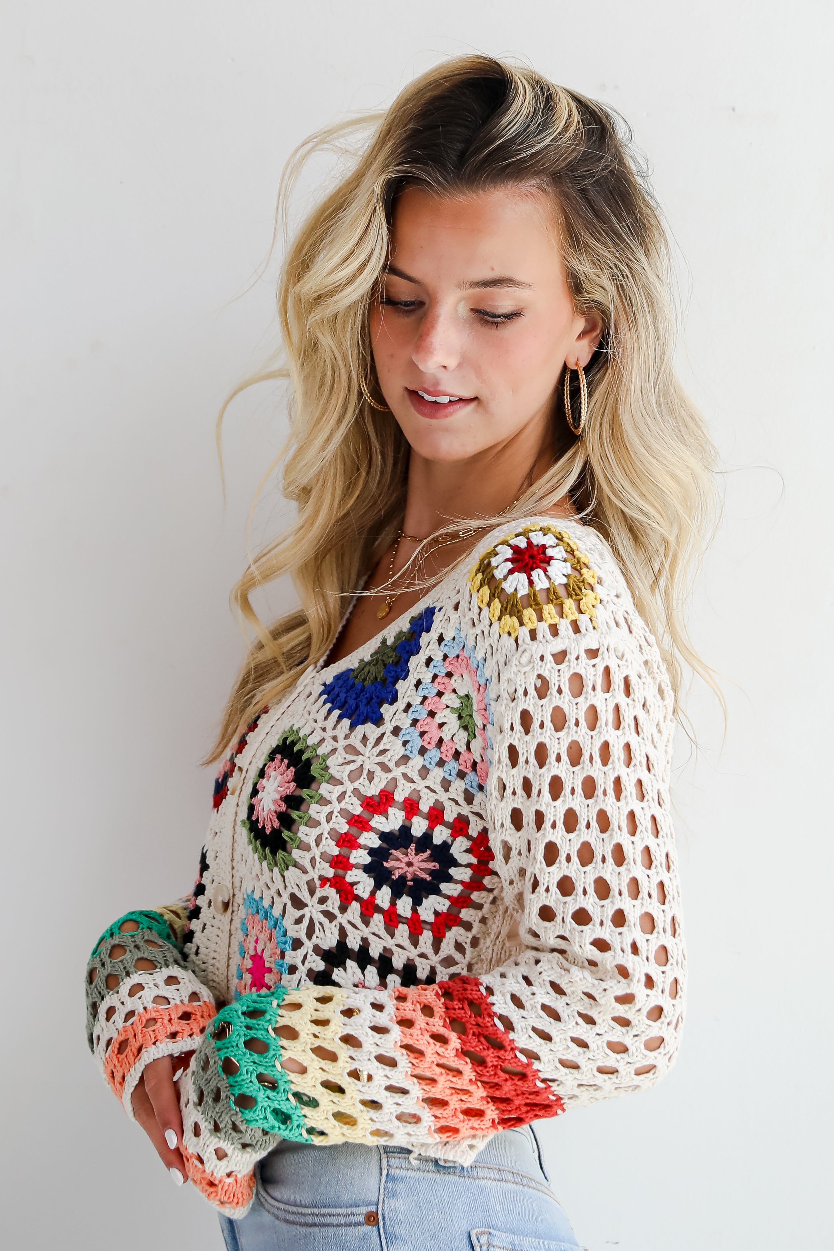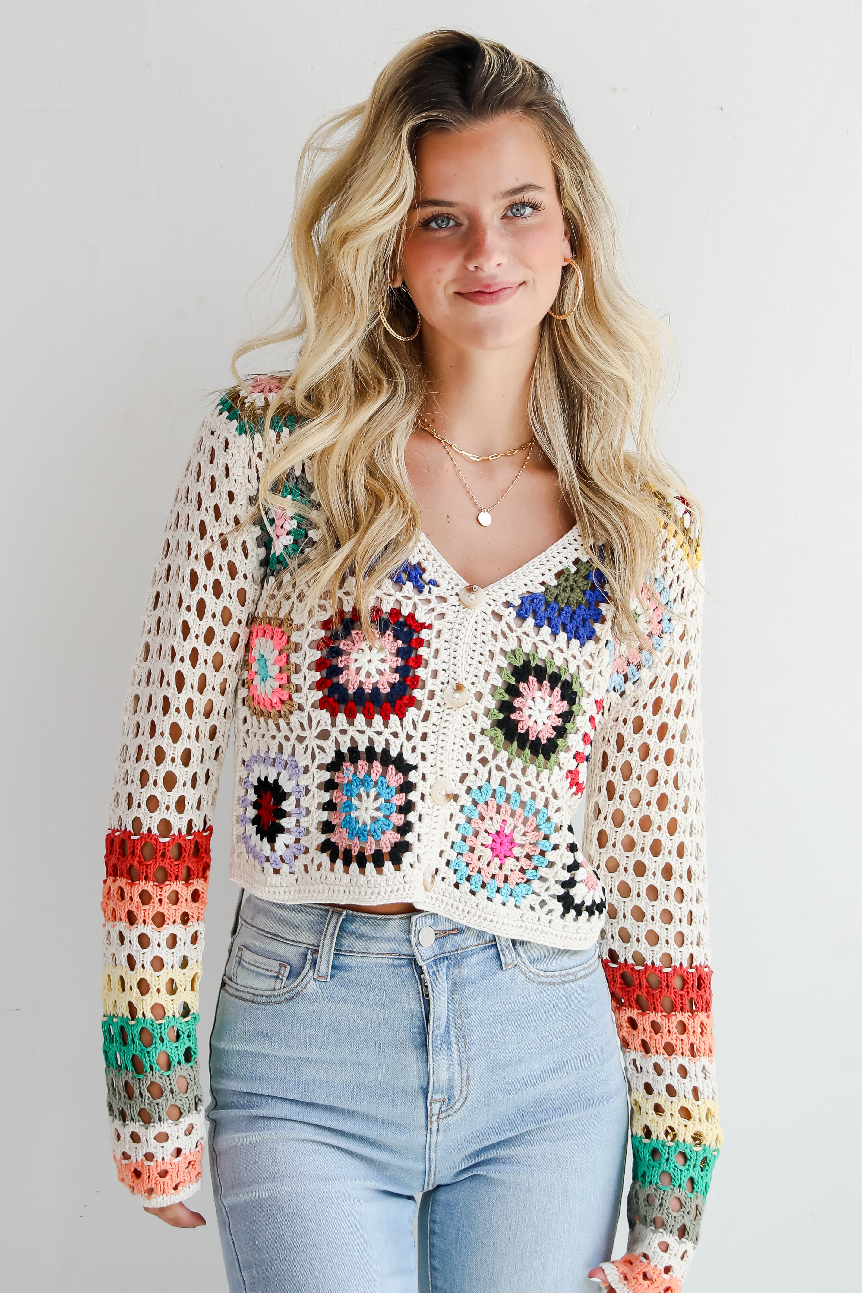 You'll be ready for dreamy days in the sun when you've got the Vibrant Crush Ivory Crochet Knit Top! This top features an array of bright, cheerful colors woven into an intricate crochet knit pattern, creating a unique, eye-catching design that adds texture and personality to any outfit. The button-front style offers versatility and ease of wear, allowing you to style it open over a tank or buttoned up for a more polished look. Crafted from soft, breathable yarn, this top provides comfort while the open knit keeps it lightweight and perfect for layering. Pair it with high-waisted jeans or a flowy skirt to complete your effortlessly chic look!