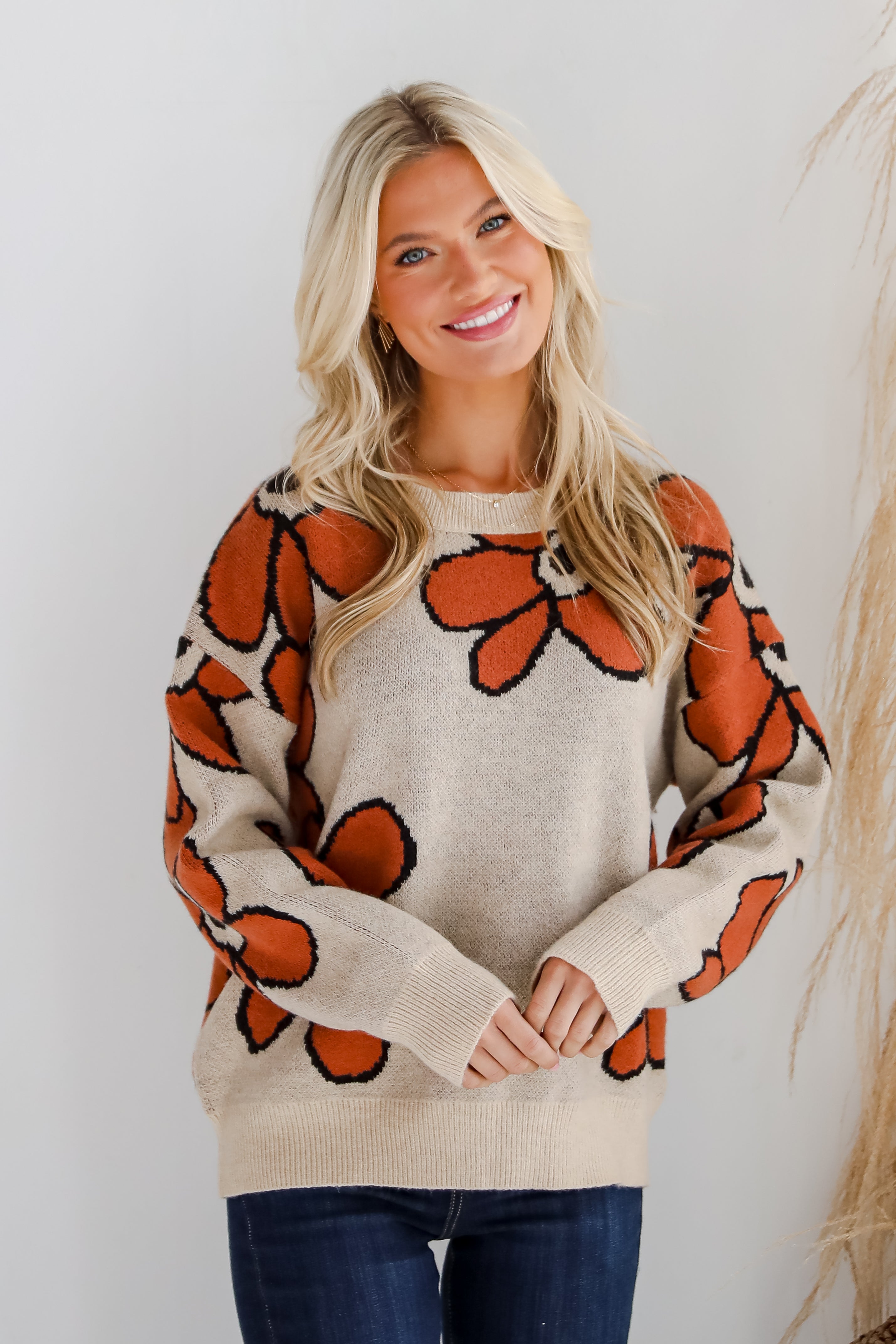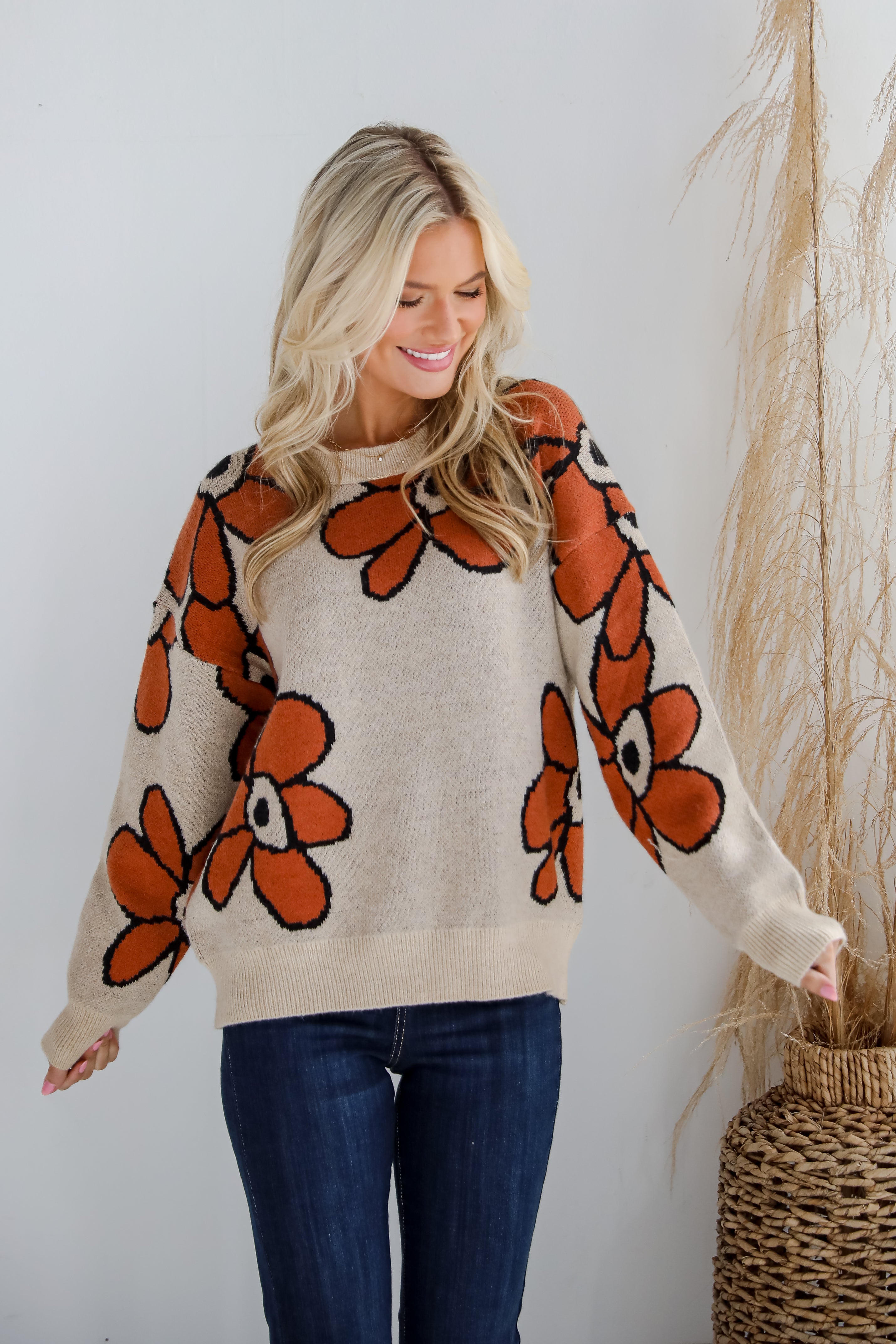 Finish off any look with a charming piece like the Vibrant Season Natural Floral Sweater! Crafted from a soft and breathable fabric, this sweater offers a cozy fit that’s perfect for layering during cooler months. The natural base color provides a warm, neutral backdrop for the stunning rust floral design, creating a harmonious blend that adds a pop of color and personality. With a classic silhouette and long sleeves, this sweater is versatile enough for both casual outings and more polished looks. Pair it with jeans or skirts for a chic and effortlessly stylish ensemble that showcases your unique flair!