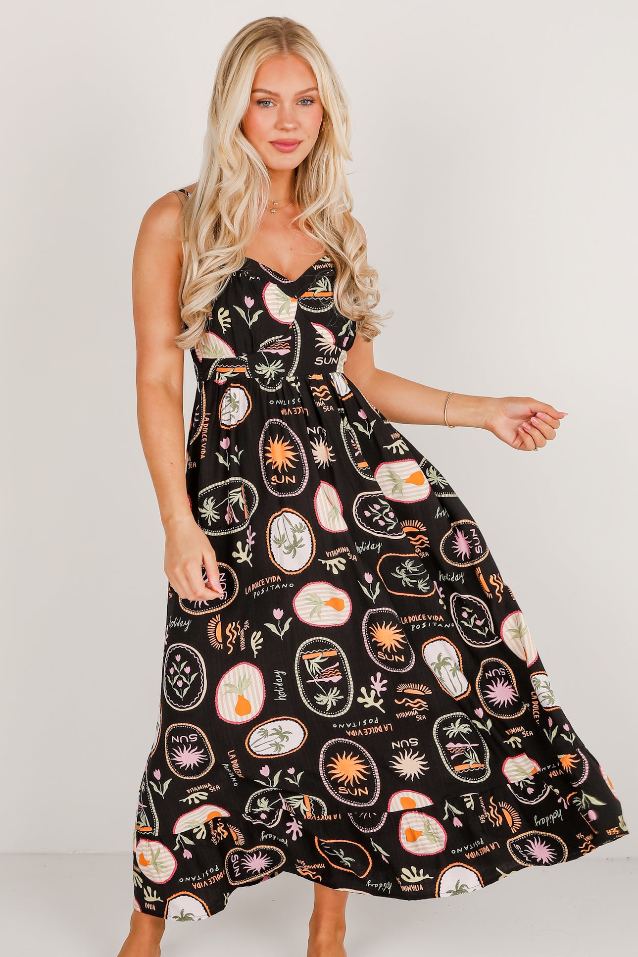 The Vitamin Sea Black Maxi Dress is vacay-ready! Set against a sleek black backdrop, the vibrant tropical print adds a pop of color and exotic flair. Delicate spaghetti straps and a flowy maxi silhouette keep things light and airy, perfect for beachside dinners or sunset strolls. Just add sandals and statement earrings for a getaway look that’s equal parts relaxed and refined!