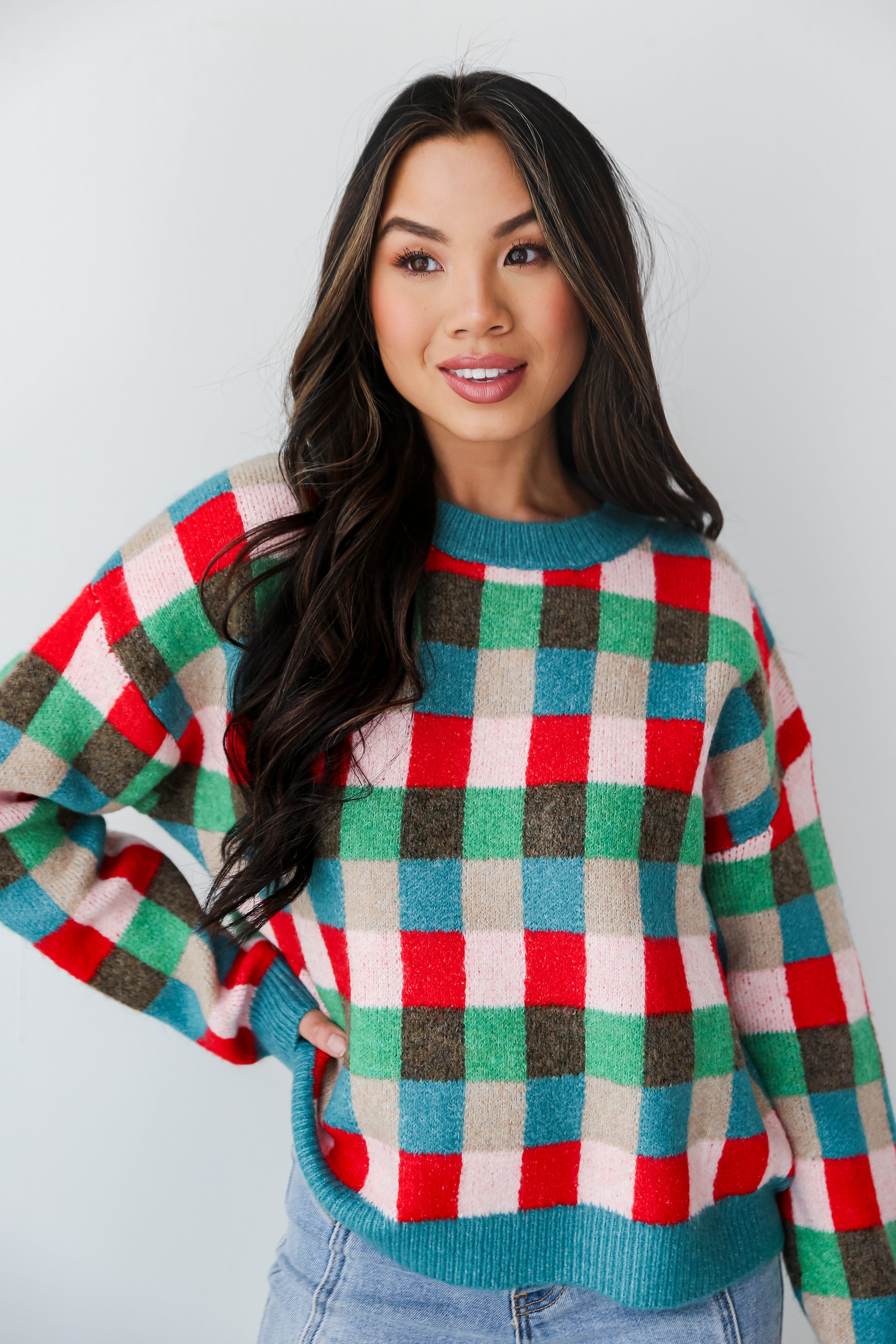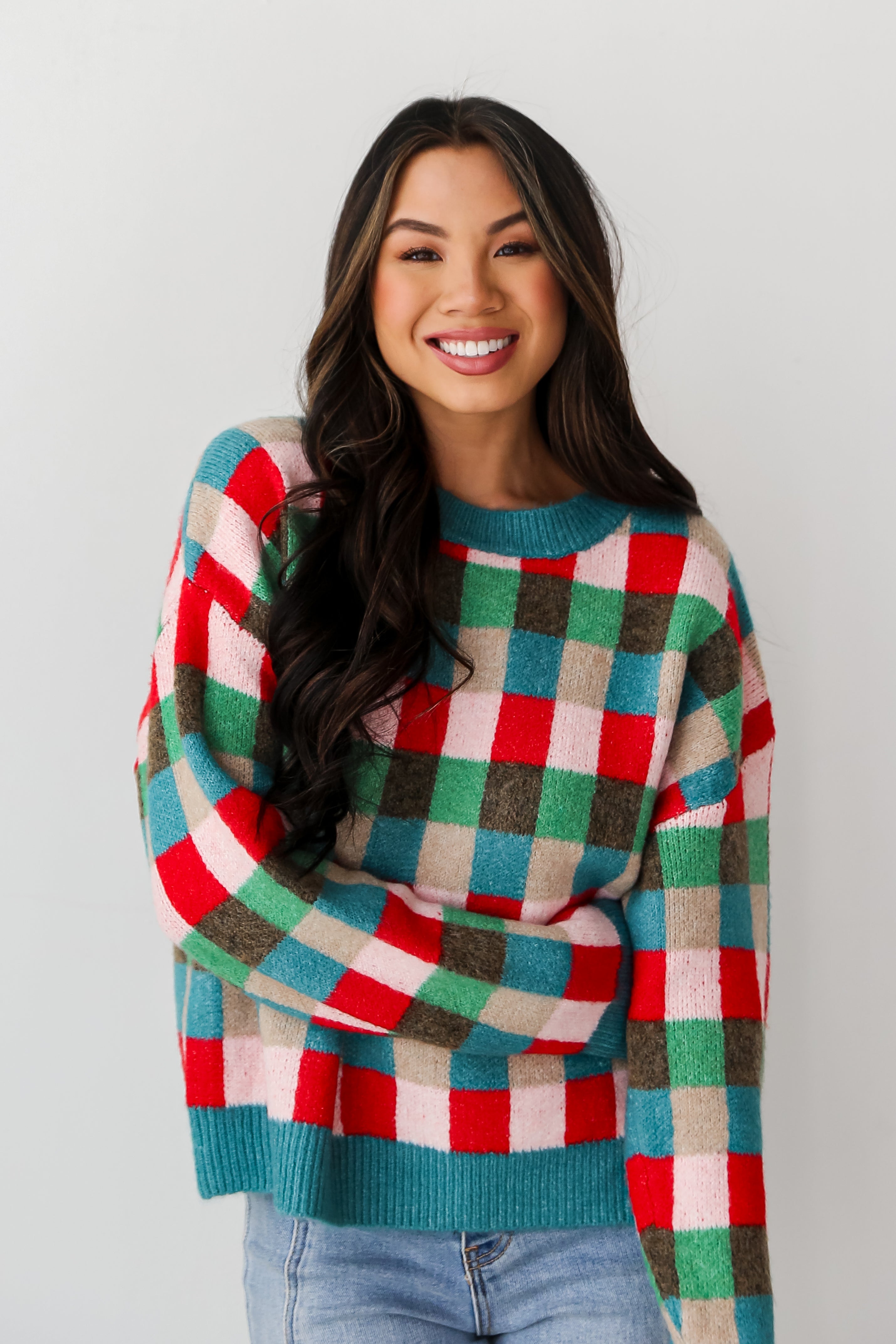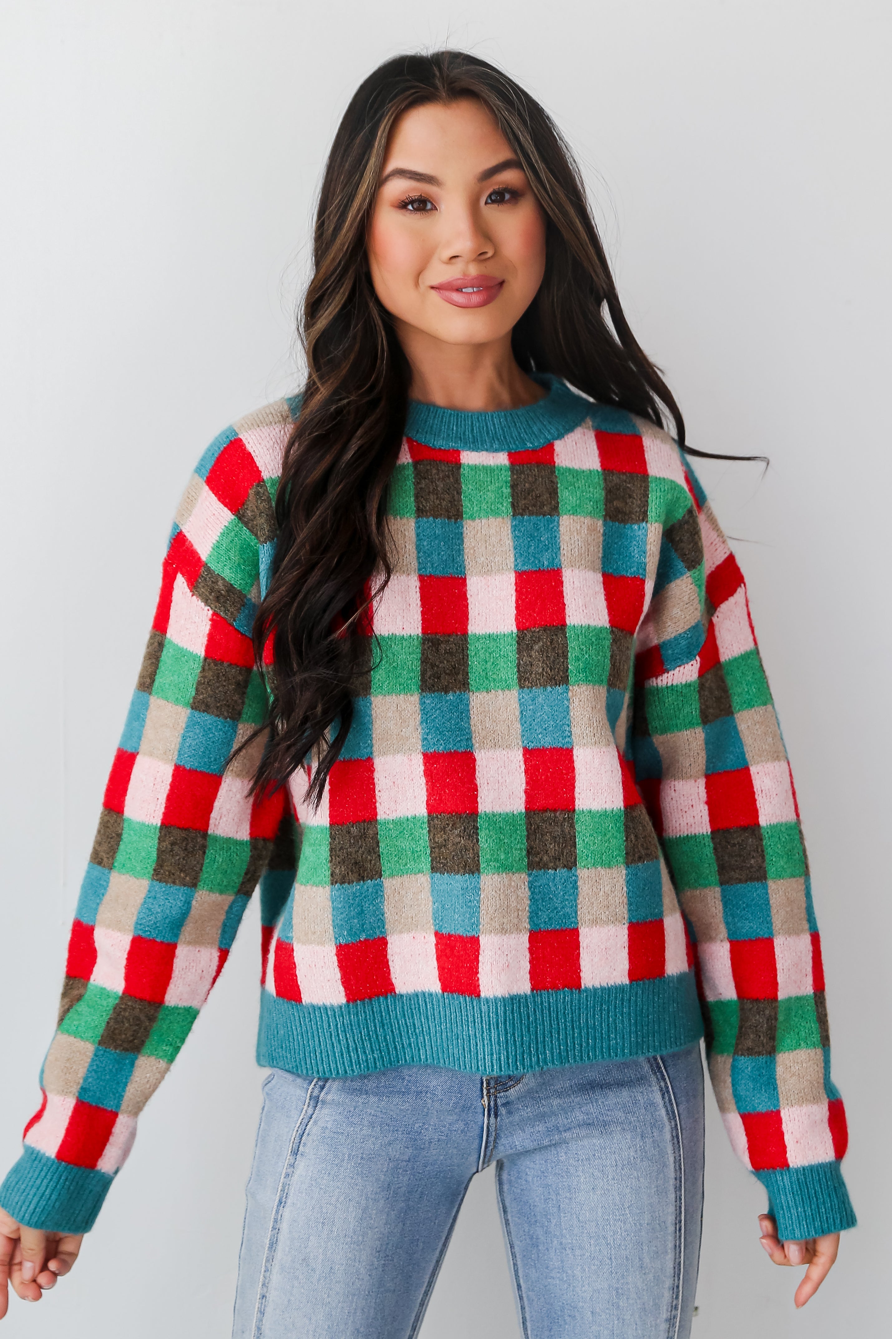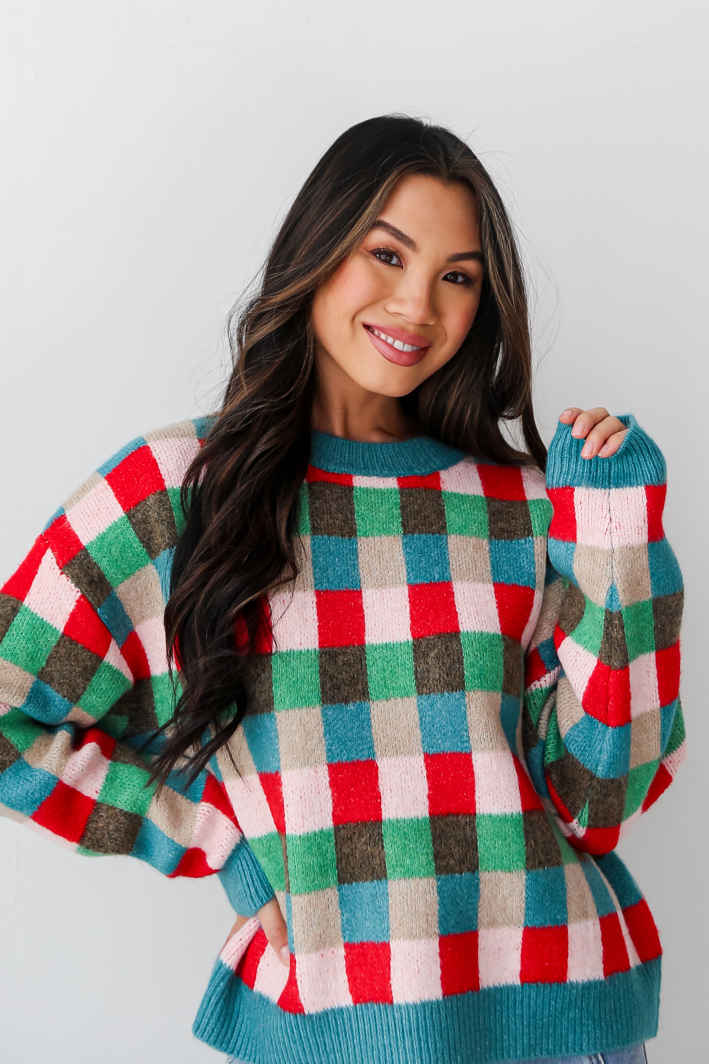 Brighten up the dark winter days with an adorable (and essential) accessory like the Warm Expression Checkered Sweater! This sweater is a celebration of playful patterns and a kaleidoscope of hues, making it a must-have for those who dare to stand out and embrace their unique sense of fashion. The dynamic checkered pattern features a captivating array of colors, creating a visual symphony that instantly elevates your look. Crafted with meticulous attention to both comfort and design, the soft knit of this sweater provides a cozy and warm embrace against your skin. The relaxed fit allows for ease of movement, making it a versatile choice for casual outings, creative workplaces, or cozy evenings at home. Pair this colorful checkered sweater with your favorite jeans for an effortlessly chic daytime look, or layer it over a skirt for a bold and eclectic statement. The versatility of this piece invites you to explore various styling options, letting your personality shine through your fashion choices!