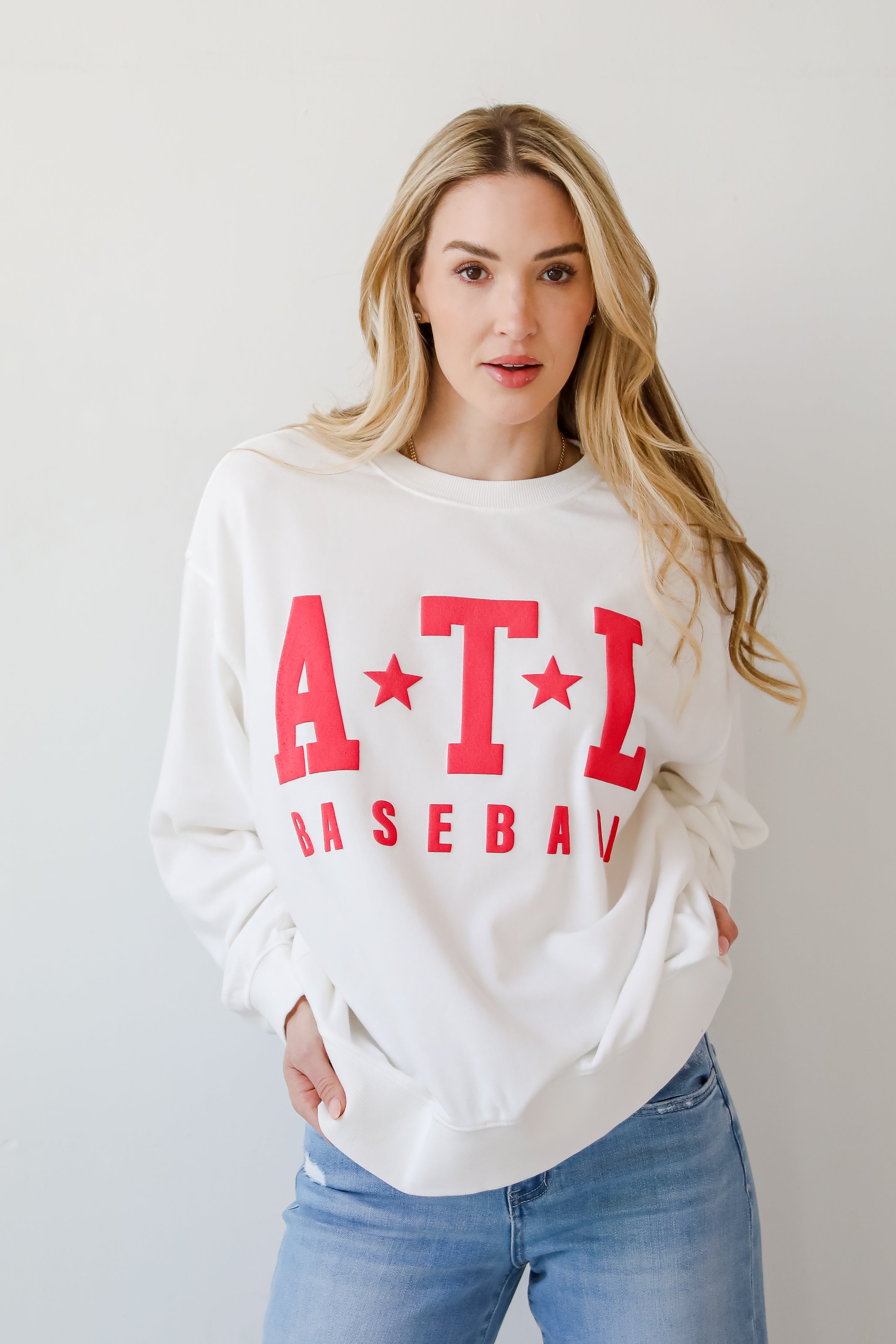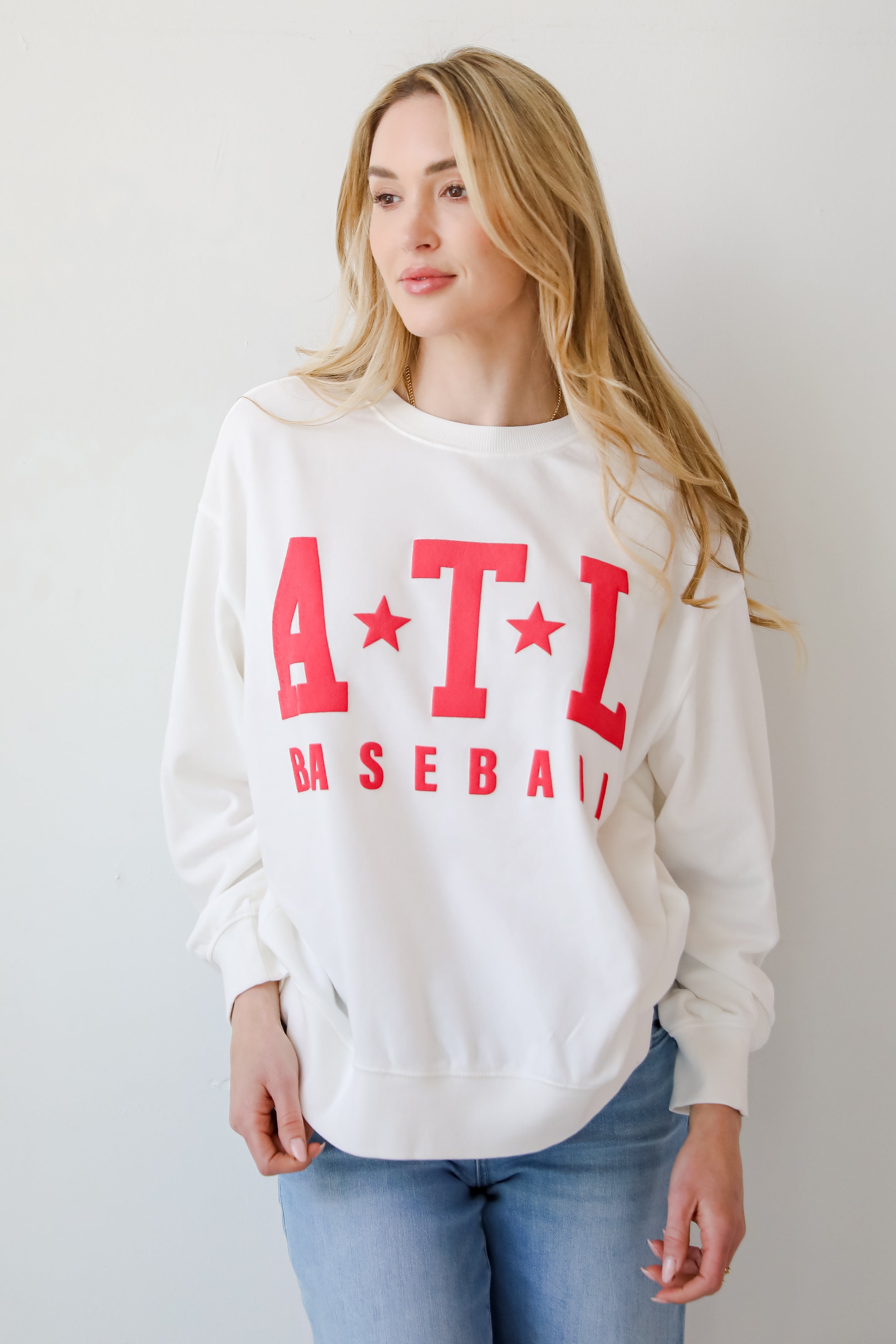 Calling all baseball fans, the White ATL Baseball Star Sweatshirt was made just for you! This comfy sweatshirt is designed with a soft and stretchy knit with a fleece interior. It features a crew neckline, long sleeves, a relaxed fit, and the words "ATL Baseball" on the front. Style the White ATL Baseball Star Sweatshirt with your favorite denim and sneakers for a casual look!