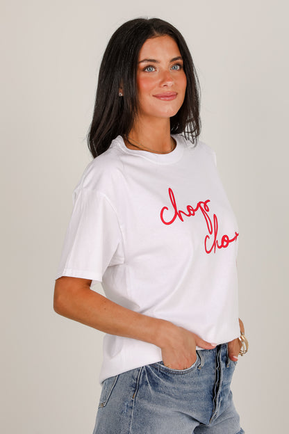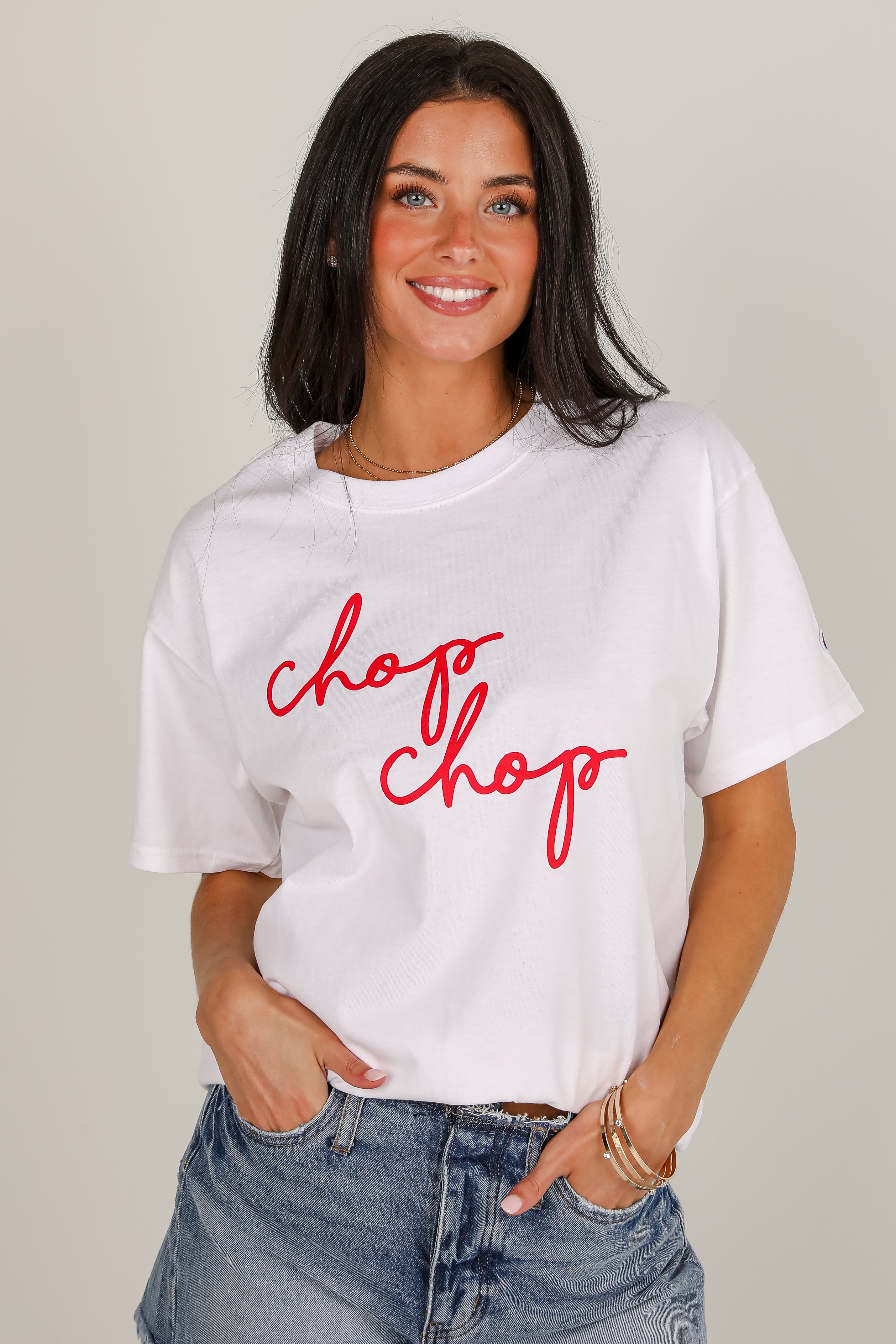 Calling all baseball fans, the White Chop Chop Script Tee was made just for you! This comfy tee is designed with a soft and stretchy knit. It features a crew neckline, short sleeves, a relaxed fit, and the words "Chop Chop" on the front. Style the White Chop Chop Script Tee with your favorite cutoff denim shorts and a baseball hat for the perfect game day look!