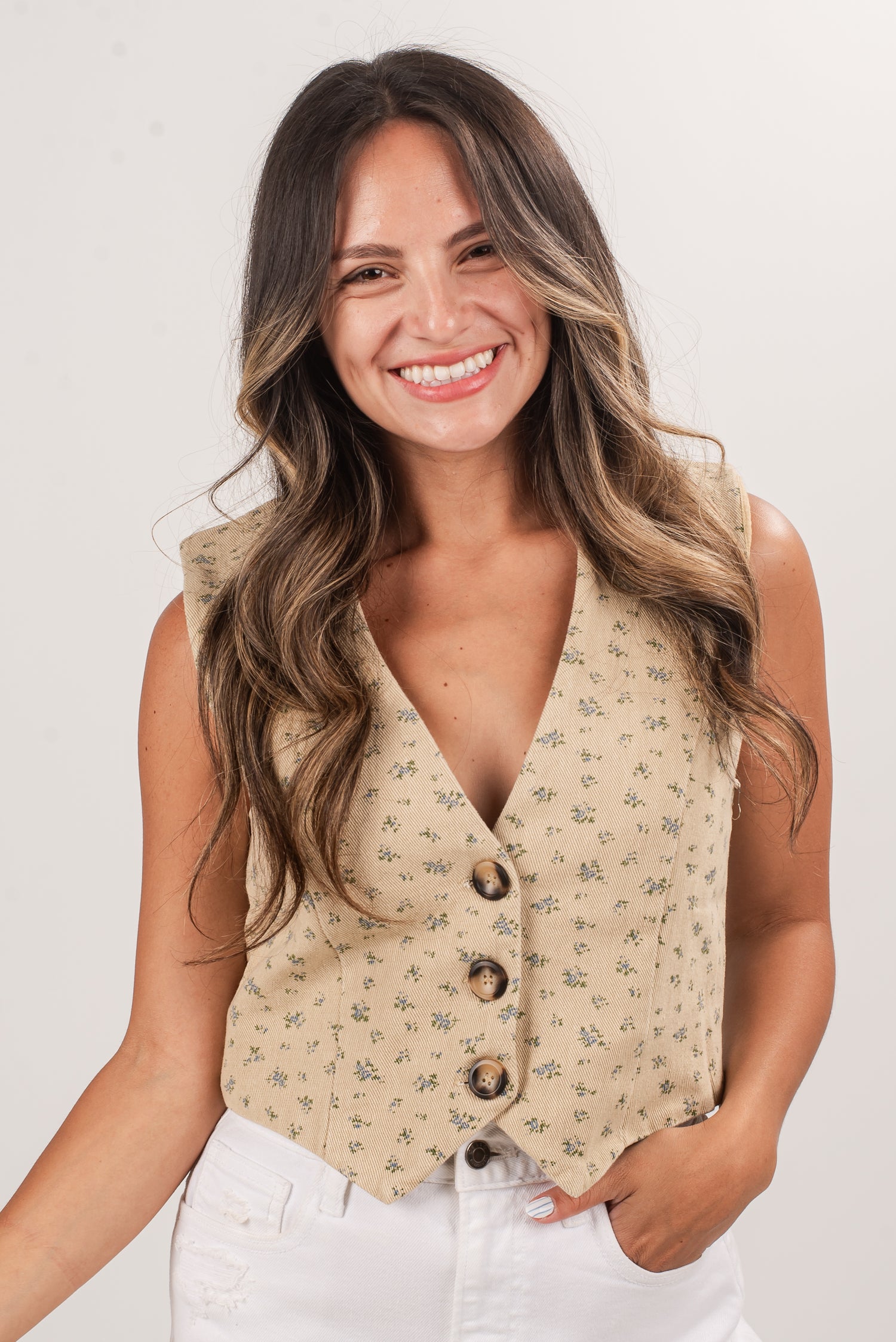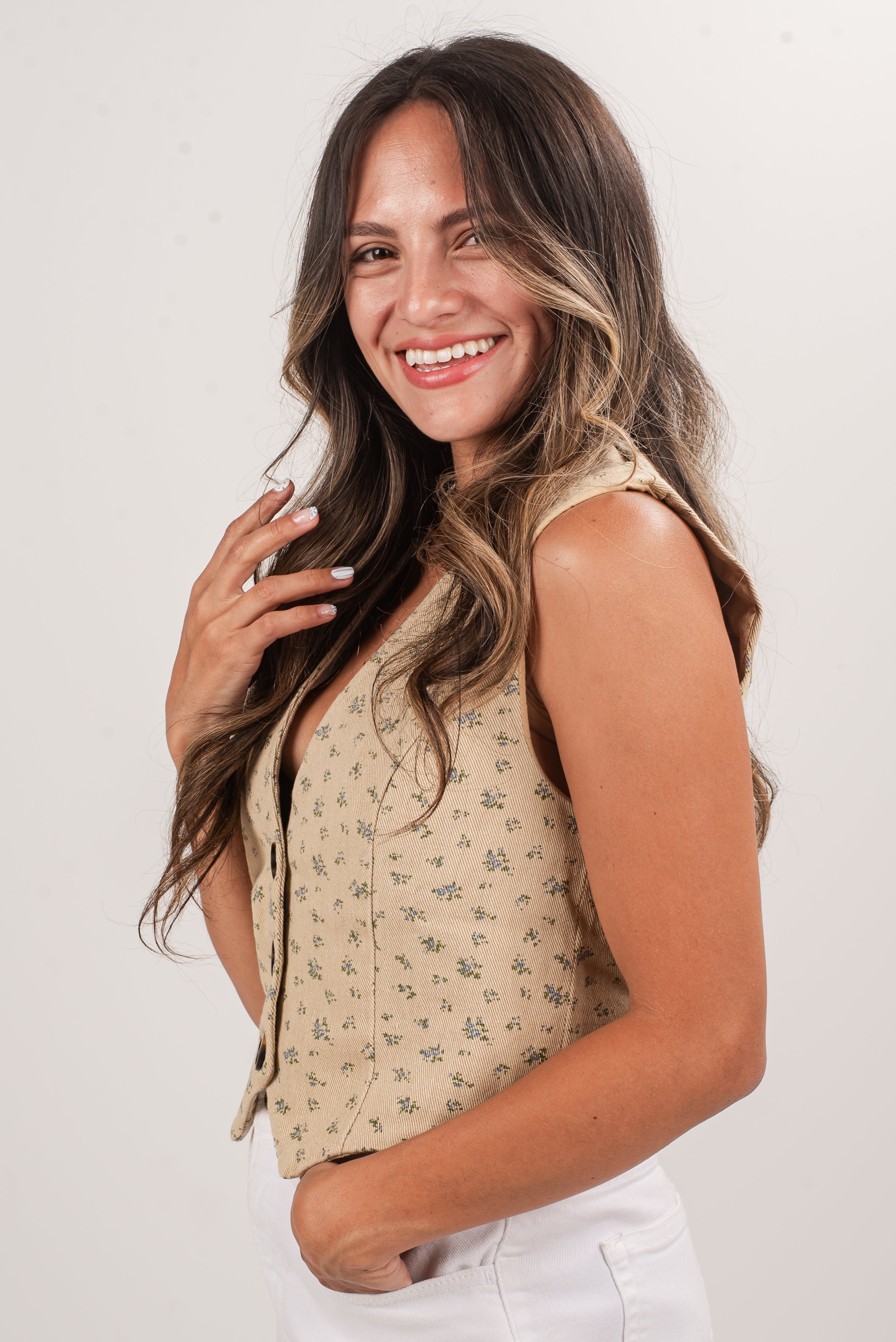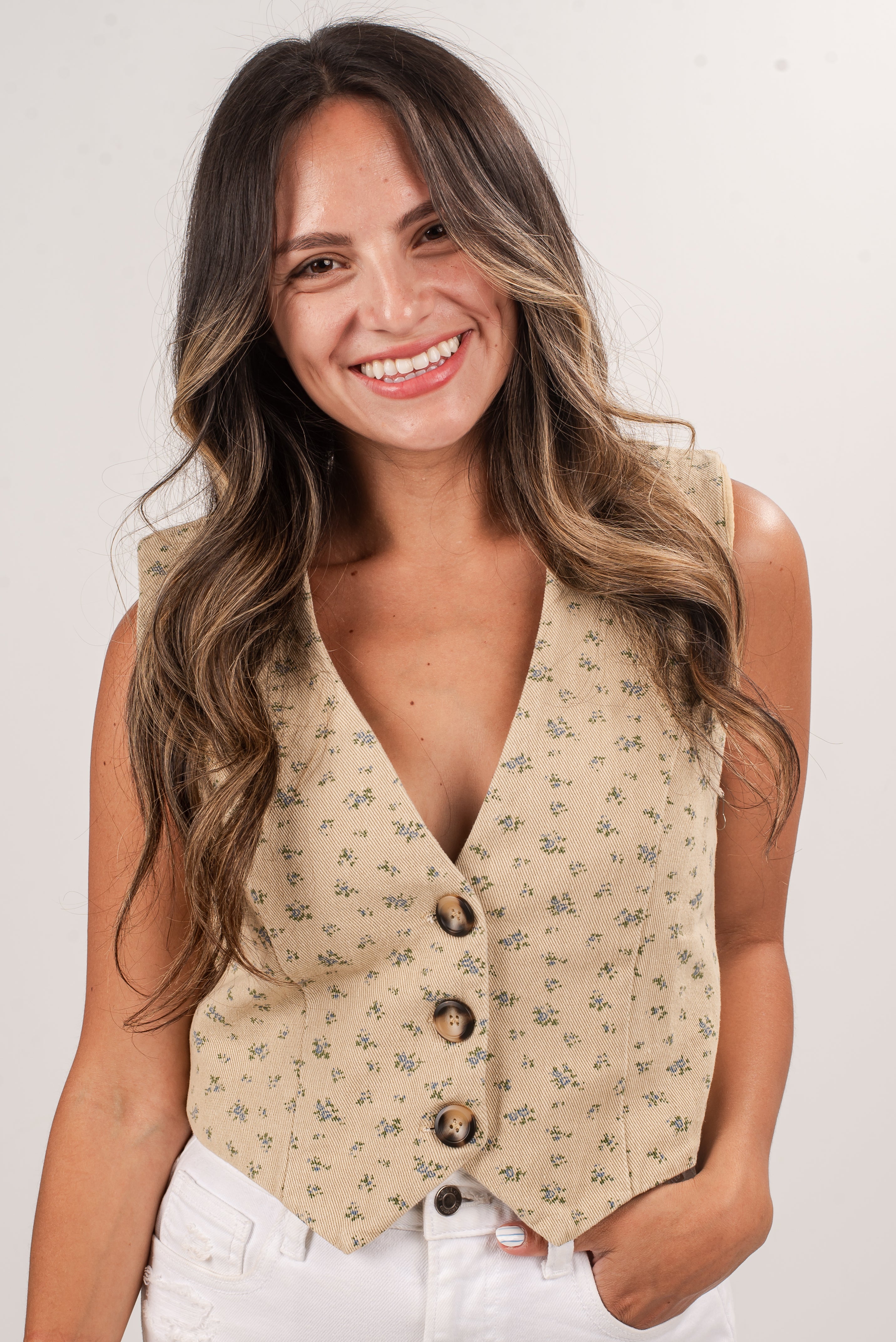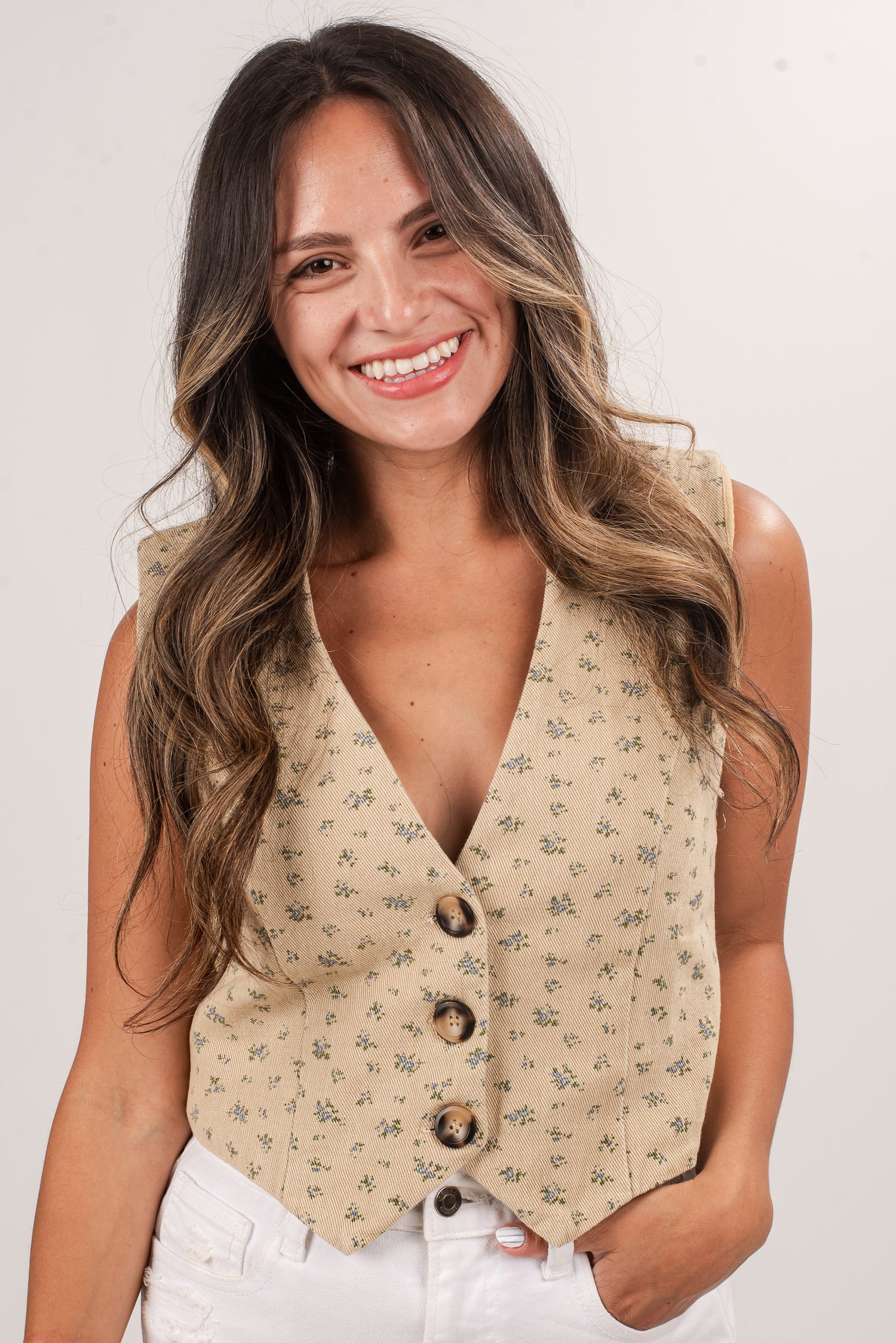 The Wish You Were Here Beige Floral Denim Vest is a classic with a hint of whimsy! This trendy piece features a flattering V-neckline, a button-up front, and a structured denim fabric adorned with a delicate floral print for the perfect blend of edgy and romantic. The tailored fit and versatile design make it easy to style – layer it over a basic tee for a casual vibe or pair it with the matching bottoms for a chic, coordinated look. Perfect for transitioning from season to season with effortless style!