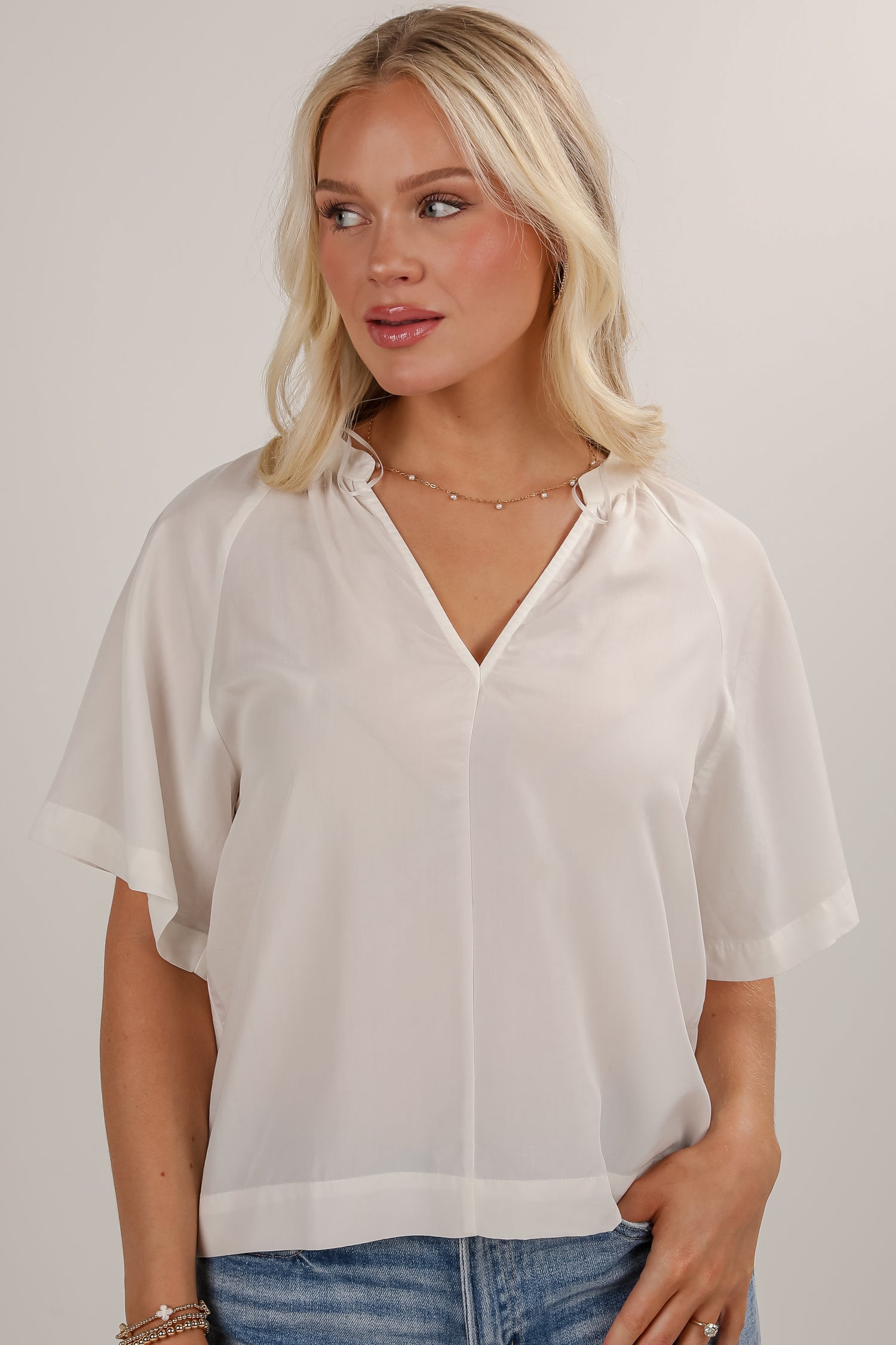 There's no easier way to have everyone admire your stylish demeanor than with the You Have My Attention Blouse! Designed with a soft, lightweight fabric, this top features a flattering V-neckline and relaxed silhouette that blends comfort with effortless style. Perfect for pairing with jeans, shorts, or a flowy skirt, it’s a go-to piece for casual days when you still want to feel put-together. Whether you're running errands or heading to brunch, this blouse brings timeless charm with a modern twist! Available in 2 colors.