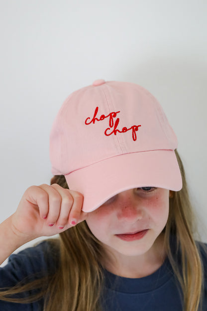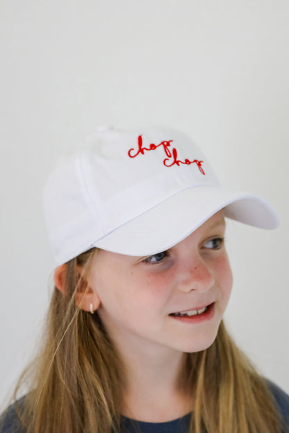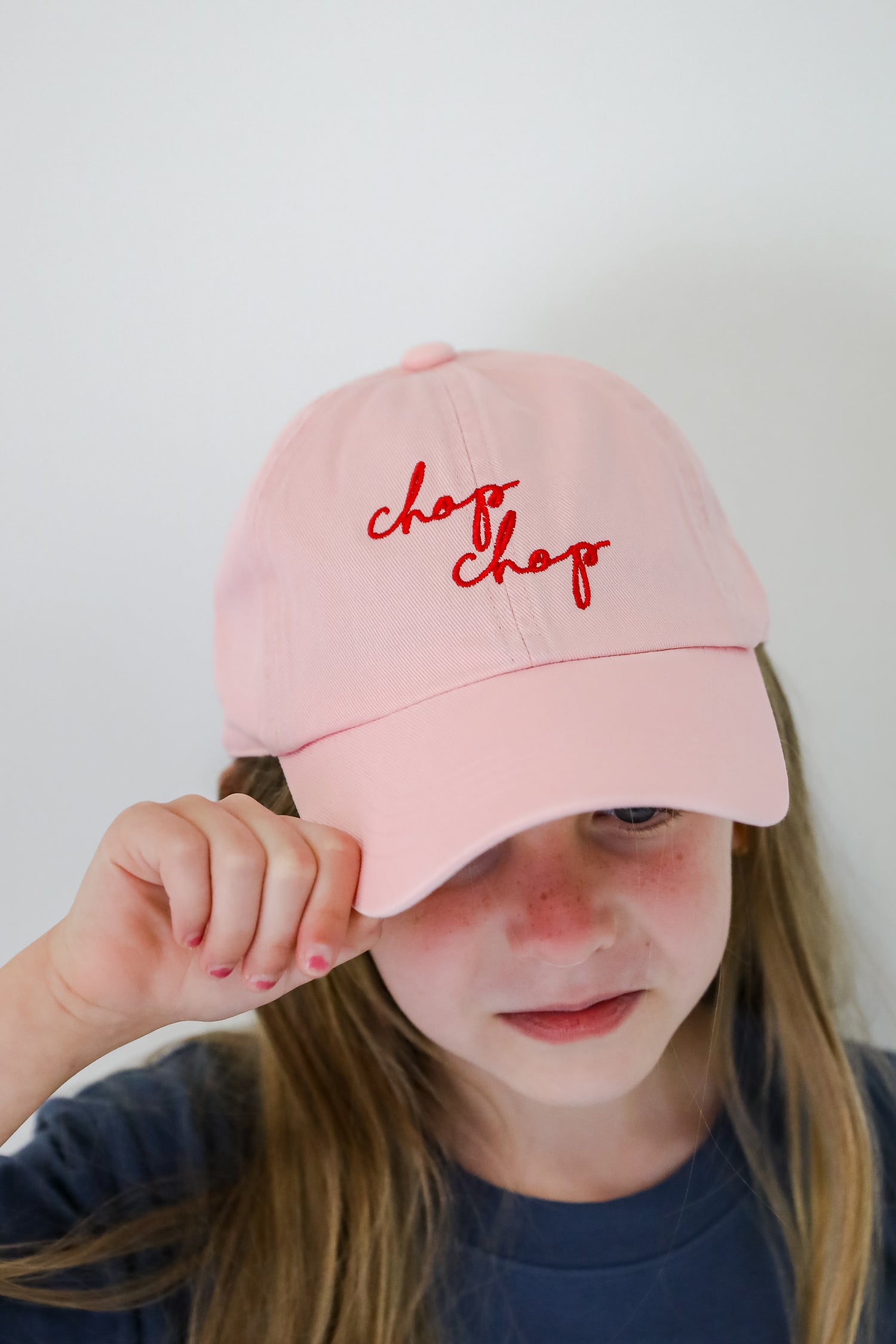 Calling all little baseball fans, the Youth Chop Chop Embroidered Hat was made just for you! This cute hat is made of a soft cotton construction. It has a rounded top and a slightly rounded brim with "Chop Chop" embroidered on the front! Available in 3 colors.